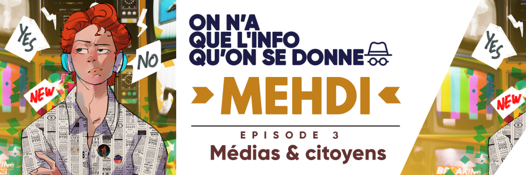 L’épisode 3 « Mehdi » s’axera autour des relations qu’ont les citoyens avec les médias. S’y sentent-ils représentés ? Quelle place souhaitent-ils éventuellement occuper ? Ont-ils confiance dans la manière dont l’info est proposée dans les médias ? Quelles pistes pour que journalistes et citoyens puissent travailler « ensemble » ? Tout cela sera évoqué de plusieurs manières pour permettre au public de faire le tour de la question :