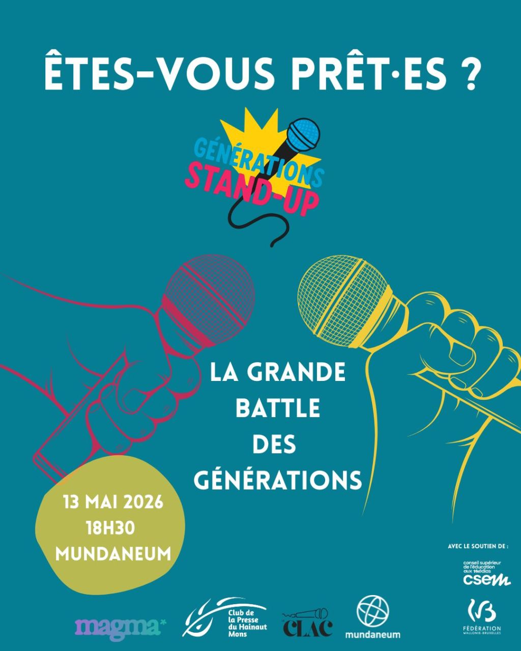 Ce spectacle de stand-up intergénérationnel marque la conclusion de la première étape d’un projet initié par le Club de la Presse du Hainaut-Mons, et soutenu par la Fédération Wallonie-Bruxelles, dans le cadre de l’appel à projets du CSEM, en partenariat avec Magma ASBL, le CLAC et le Mundaneum.
